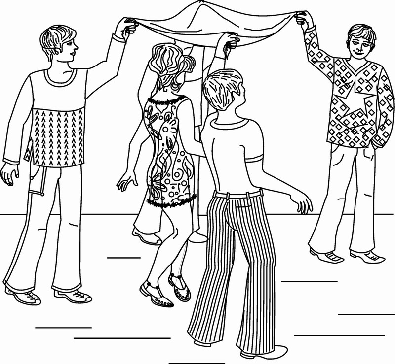 Играют две команды, состоящие из четырех девушек и одного юноши или, наоборот, из четырех юношей и одной девушки. Ведущий выдает команде платок, который четверо берут за углы и растягивают, подняв руки вверх, а один человек находится под этим «зонтом». Под музыку несущие «зонт» идут по кругу, а находящийся под ним вращается вокруг себя. Как только музыка останавливается, ведущий называет место на теле человека под «зонтом», где нужно повязать платок: голова, шея, рука, мизинец и т.д. Из двух команд побеждает та, которая сделает это быстрее. Игра повторяется, чтобы определить выигравшую команду по большему количеству побед (см. рис.).