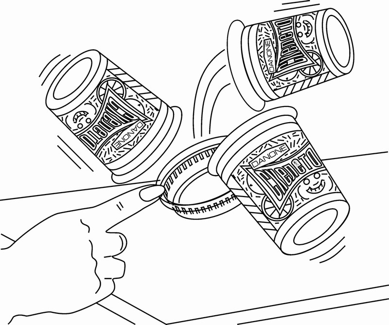 Для игры понадобятся три баночки из-под йогурта и одна прозрачная крышка. Играют два человека, лучше играть на полу. На прозрачную крышку, лежащую бортиками вверх, устанавливают три банки, перевернутые дном вверх. Игрок с силой ударяет по краю крышки, чтобы банки отскочили и перевернулись (см. рис.). Если в результате удара все банки лежат на боку, то ход переходит ко второму игроку, и баллы не начисляются. За банку, которая после броска стоит дном вниз, начисляется 3 балла, за банку, стоящую дном вверх — один. Количество баллов удваивается или утраивается, если такое положение приняла не одна банка, а две или три. Игра продолжается до заранее обговоренного количества баллов.