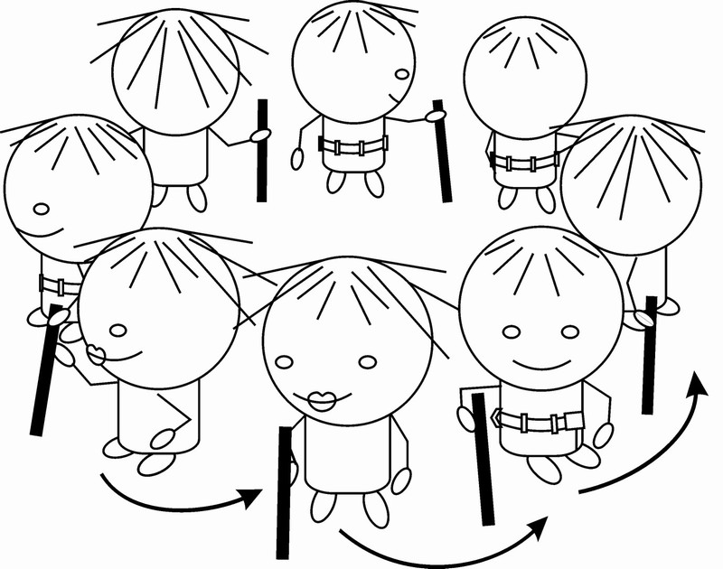 Каждая из двух команд образует круг (играющие становятся спинами внутрь). В правой руке игроки держат гимнастическую или любую другую палку, которую ставят на пол перед собой. По команде все делают шаг влево по кругу, отпуская свою палку и стараясь перехватить палку соседа (см. рис.). Нельзя подхватывать палку, пока ее не отпустили, и шагать, не отпустив свою. Тот, кто уронил палку, покидает круг. Побеждает команда, в которой через две минуты осталось больше игроков.