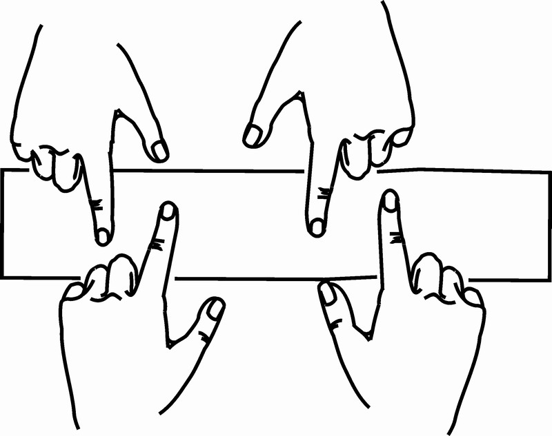 Отрезается длинная полоска скотча и кладется липкой стороной вверх на середину стола. Игроки делятся на две команды, становятся по разные стороны стола и "приклеивают" свои указательные пальцы к скотчу со своей стороны (см. рис.). По команде игроки начинают тянуть скотч на себя, при этом "отклеившиеся" игроки покидают игру. Побеждает команда, на чьей половине стола оказался скотч после того, как все игроки выбыли.