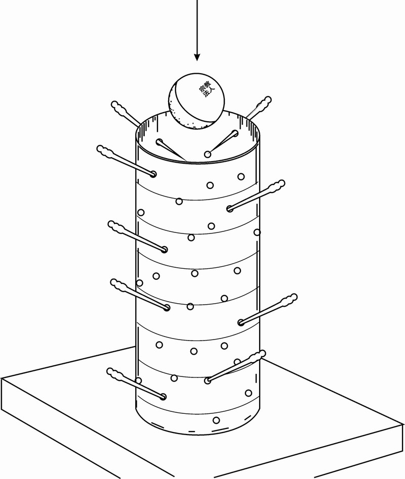 Для игры нужны банка из-под чипсов «Pringles», шарик для пинг-понга и зубочистки (или шпажки для канапе). У банки отрежем низ, чтобы получилась труба, сверху рисуем горизонтальные линии (через 1,5-2 см) и протыкаем шилом большое количество отверстий, в которые вставляем зубочистки. Сверху кладем шарик (см. рис.). Игроки по очереди вытаскивают по одной зубочистке, начиная с верхнего сектора. Тот, у кого шарик скатился с зубочистки, выходит из игры. Побеждает оставшийся игрок.