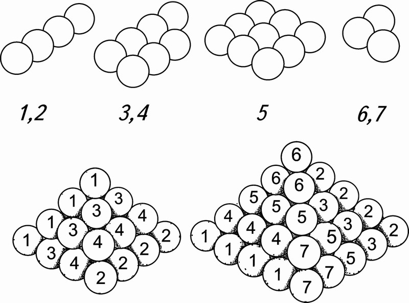 Для строительства пирамидок можно использовать шарики для пинг-понга, склеенные в определенные фигуры, или даже крупные бусы. Форма фигур и их порядковые номера указаны на рис. Два игрока получают детали из шариков и строят пирамидку по заданным параметрам (например, 4х4). Побеждает игрок, быстрее справившийся с головоломкой.