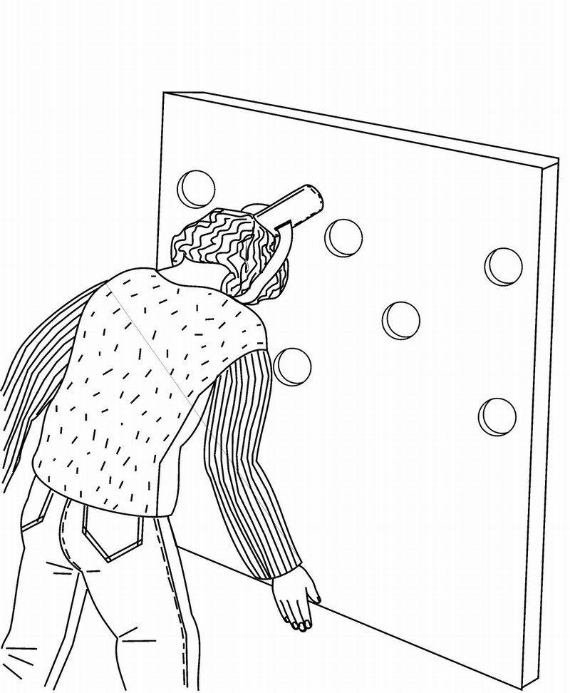 Для конкурса готовят несколько отрезков пластиковой трубы, на боковых стенках которых делают отверстия и в каждый отрезок продевают резинку. Игроки завязывают резинку на голове — они «кнопки». С завязанными глазами они пробуют попасть «острием» в круглое отверстие на большом листе (см. рис.), который держат, не двигая, два человека. Второй игрок находится за листом и корректирует движения «кнопки». Побеждает пара, «кнопка» которой быстрее «прикололась».