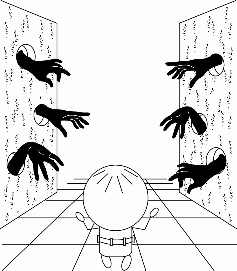 Несколько игроков по очереди преодолевают длинный коридор, образованный из развернутых картонных коробок (хотя можно обойтись и без них). Время для движения ограничено 30 сек. В коробках прорезаны отверстия, в которые присутствующие просовывают кисти рук (см. рис.). На руки можно надеть перчатки, нарисовать на них контур губ губной помадой. Игрок движется вперед, стараясь перецеловать как можно больше рук. Поцелованные кисти исчезают и не появляются снова. По ним и проводится подсчет результатов.