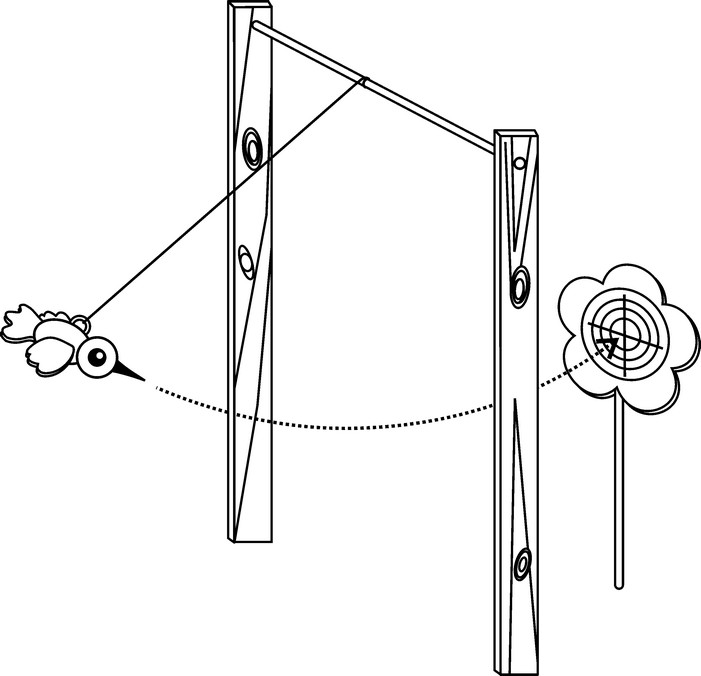 К середине перекладины, положенной на два столба, привязывают веревочку, на которой висит птица — литая из чугуна или деревянная. Деревянную птицу нужно утяжелить свинцом, в спине укрепить крючок или кольцо (в него продевают веревочку) и на голову насадить железное острие вместо клюва. К хвосту птицы привязана веревка или леска. Напротив клюва птицы ставят цель — круг, насаженный на столбик так, чтобы птица могла попадать клювом в самую середину кружка (см. рис. ). Играющий встает позади птицы, берет ее за хвост или за нитку, привязанную к хвосту, и притягивает к себе. Затем он отпускает нитку — птица летит и клювом втыкается в кружок. Вместо птицы можно привязать к веревочке металлический шарик, а в середине мишени сделать отверстие, в которое должен свободно входить деревянный гвоздик или тонкая палочка. В этом случае играющие стараются выбить гвоздик шариком.