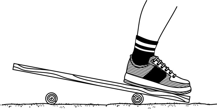На первый взгляд эта игра кажется совсем простой, но, чтобы совершить прыжок на Луну, надо проявить не только ловкость, но и немало сообразительности. На ровной площадке лежат на расстоянии 30 см друг от друга две городошные биты или гимнастические палки. Сверху поперек их укладывается доска длиной в 60 и шириной в 20-25 см. В четверти метра перед ней положен круг с изображением диска Луны. Позади доски лучше установить преграду, которая задержит доску, когда биты откатываются назад. Задача игрока — встать на доску и прыгнуть с нее на диск Луны. Секрет заключается в том, что совершить прыжок удается лишь тому, кто встанет так (см. рис.), чтобы носки ног оказались на месте, где проложена первая, ближняя к Луне, бита (гимнастическая палка). Тяжесть корпуса нужно перенести вперед, при этом задняя часть доски поднимается, а передняя своим торцом упирается в землю.