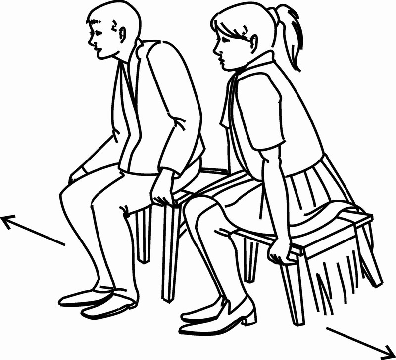 Для игры необходимы две табуретки и полотенце. Табуретки устанавливают рядом и накрывают полотенцем. На табуретки усаживается пара — мужчина и женщина. Они хватаются руками за табуретку, чтобы крепче прижать полотенце, и начинают движение в сторону, чтобы отодвинуться от своего партнера (см. рис.). Полотенце натягивается, а затем остается у кого-либо одного, он и продолжает играть со следующим партнером.