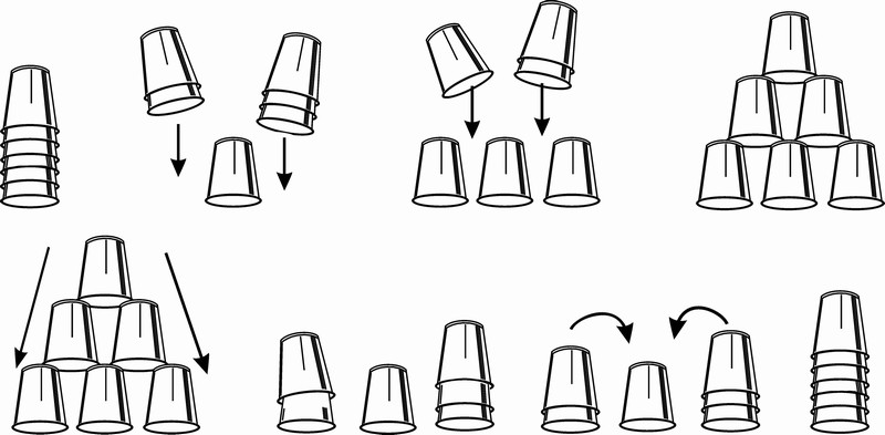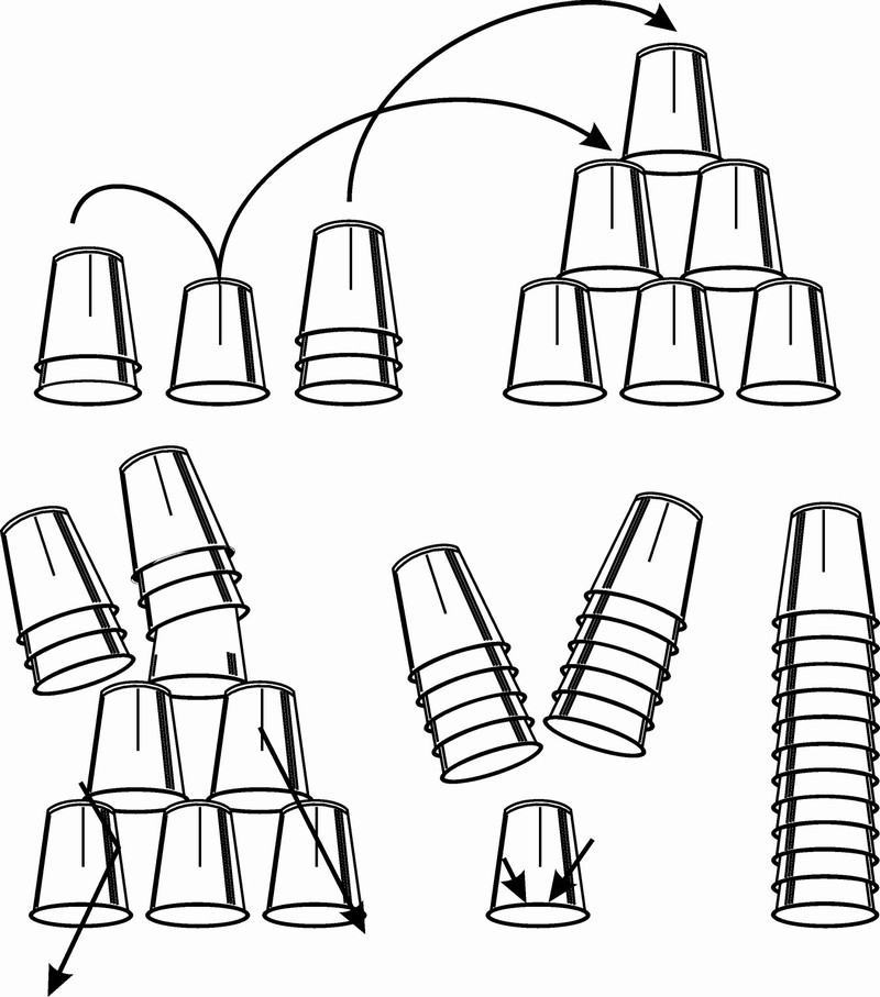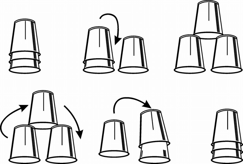 Эта простая, на первый взгляд, игра уже стала популярным видом спорта в Америке и странах Европы. Во всем мире проводятся чемпионаты, устанавливаются рекорды, возникают спортивные школы. Игра в стаканчики требует хорошего внимания и умения владеть двумя руками одновременно. Цель игры — собрать и разобрать пирамидку из стаканчиков. Самая простая комбинация — это пирамидка из трех элементов. В начале игры стаканчики стоят стопкой, дном вверх (рис. 1), руки игрока лежат на столе ладонями вниз. По сигналу игрок правой рукой берет верхний стаканчик и ставит его справа, левой рукой берет второй стаканчик и ставит его наверх. Пирамидка готова. Теперь правой рукой игрок снимает верхний стаканчик и накрывает им правый нижний стаканчик, левой рукой он ставит последний стаканчик на верх стопки. Закончив разбирать пирамидку игрок дает сигнал, что он закончил, например, хлопает в ладоши. Немного сложнее собрать и разобрать пирамидку из шести элементов. В начале игры все шесть стаканчиков также стоят стопкой дном вверх (рис. 2). Правой рукой игрок берет верхние три стаканчика, левой — следующие два. Затем правая рука ставит один стаканчик справа, левая рука — один стаканчик слева. Так же по очереди собирается второй ряд, наконец, правой рукой игрок ставит последний стаканчик на верх пирамидки. Начинаем разбирать пирамидку тоже правой рукой: накрываем верхним стаканчиком два правых, левой рукой собираем в стопку два левых стаканчика. Затем правой рукой ставим стаканчики на базовый, накрываем их стаканчиками из левой руки. Можно собирать пирамидки по одному — кто сделает это быстрее и аккуратней, а можно устроить командные состязания. Обычно в игре используют комбинации из трех пирамидок по три стаканчика (3-3-3) или берут для игры стопки по три, шесть и три стаканчика (3-6-3). Главное в этой игре — соблюдать несколько несложных правил: руки берут и ставят стаканчики по очереди, а пирамидки собираются слева направо.