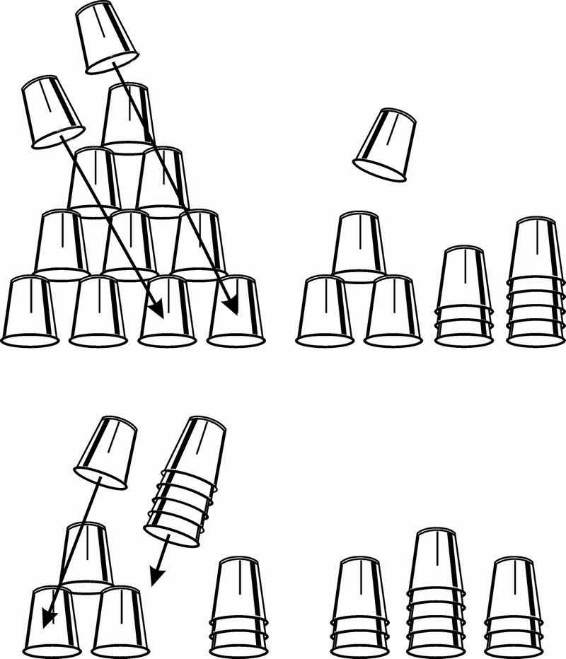 Любители этой игры постоянно придумывают новые варианты. Настоящие мастера играют вслепую или пользуются только одной рукой. Спортсмены складывают пирамидки, отжимаясь от пола или приседая. Но самым распространенным вариантом игры стал цикл. Для него берем 12 стаканчиков и складываем в три стопки по три, шесть и три. Строим пирамидки слева направо, а затем в таком же порядке разбираем их. Но, собрав последнюю стопку из трех стаканчиков, мы правой рукой ставим ее на левую стопку. Теперь перед нами две стопки по шесть стаканчиков в каждой. Из них мы строим две пирамидки так, как было описано в игре «Быстрые стаканчики» (см. рубрику "Вся наша жизнь - игра!"). Разбирая первую пирамидку, мы оставляем в каждой руке по три стаканчика и с их помощью разбираем вторую (рис. 1). Получилась стопка из двенадцати стаканчиков. Правой и левой рукой по очереди мы снимаем по одному стаканчику и ставим их по сторонам стопки. Из оставшихся десяти стаканчиков мы опять строим пирамидку. Разбираем ее так: берем в каждую руку стоящие по бокам стаканчики, правой рукой собираем четыре правых стаканчика из пирамидки, левой рукой собираем следующие три (рис. 2). На столе остается пирамидка из трех стаканчиков, в левой руке — четыре элемента, в правой — пять. Ставим на стол стопку из правой руки, затем стопку из левой руки, но последний стаканчик вновь поднимаем в воздух. С его помощью собираем два левых стаканчика из маленькой пирамидки. Поднимаем правой рукой пять стаканчиков и накрываем ими последний. Ставим на стол стопку из левой руки. Перед нами стопки по три, шесть и три стаканчика. Цикл окончен.
