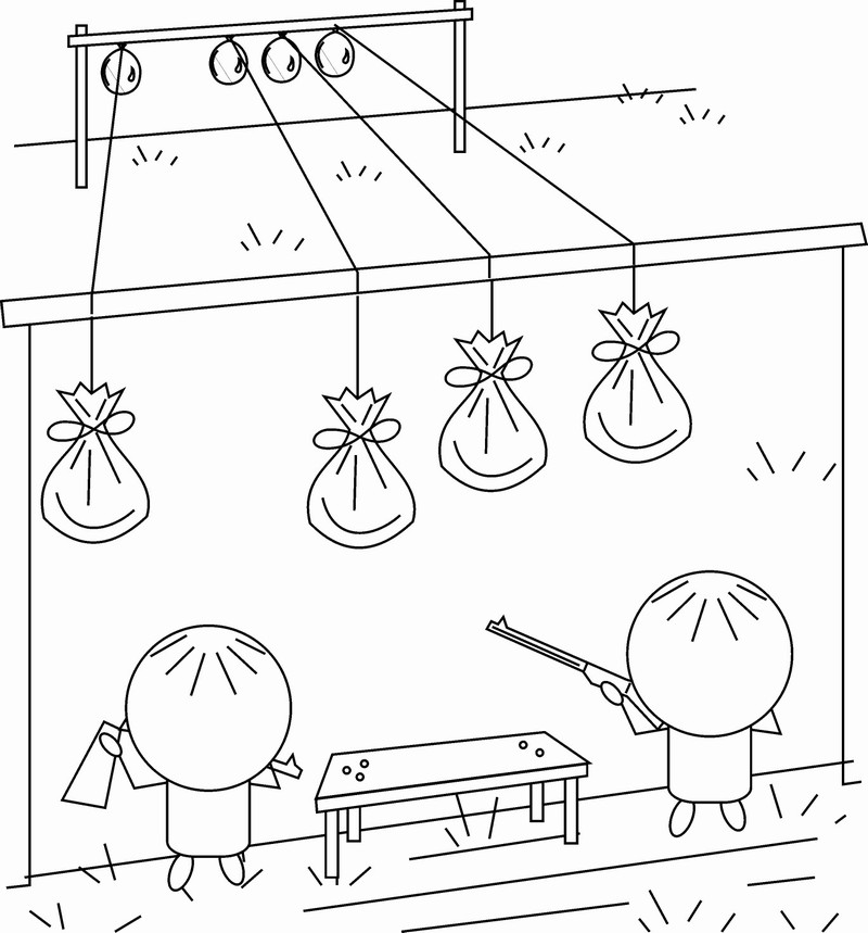 Для игры понадобятся два пневматических ружья и воздушные шарики. На перекладине на высоте 2,5-3 м на рыболовную леску подвешивается приз (букет цветов, коробка конфет и т. д.). Другой конец лески протянут к воздушному шарику, который закреплен в 20-30 м от участников (см. рис.). Шарик можно положить и на землю, зафиксировав скобой в виде буквы «п». Участники стреляют в один шарик по очереди. Если вместо приза использовать емкости с водой и укрепить два шарика, то участники конкурса стреляют в чужой шарик.
