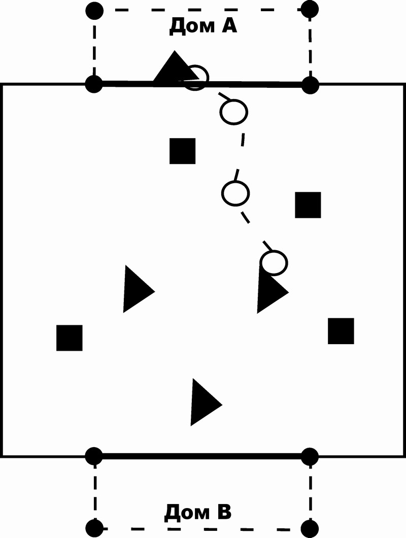 Играют командами (количество участников в команде от 3 до 10). Реквизит: одна летающая тарелка (обыкновенная детская игрушка) и размеченное на два дома поле произвольного размера (см. рис.). Дома, как футбольные ворота, имеют 4 штанги, которые составляют прямоугольник на земле. Задача команды - поймать тарелку, пущенную с поля своим игроком, в чужом доме. Игра начинается перебрасыванием тарелки от одной команды к другой. Участник с тарелкой одной ногой обязан стоять на месте. Можно перекидывать тарелку между своими членами команды. Можно сбивать пущенную противником тарелку, в этом случае тарелка переходит тому, кто ее сбил, и все продолжается. Если тарелка упала на землю, она переходит противнику, он бросает ее с места падения. После 3-х голов команды меняются домами. На рисунке показано как команда "Треугольники" (их ворота В) забивает гол в ворота А команды "Квадраты". Тарелка обозначена кружком.