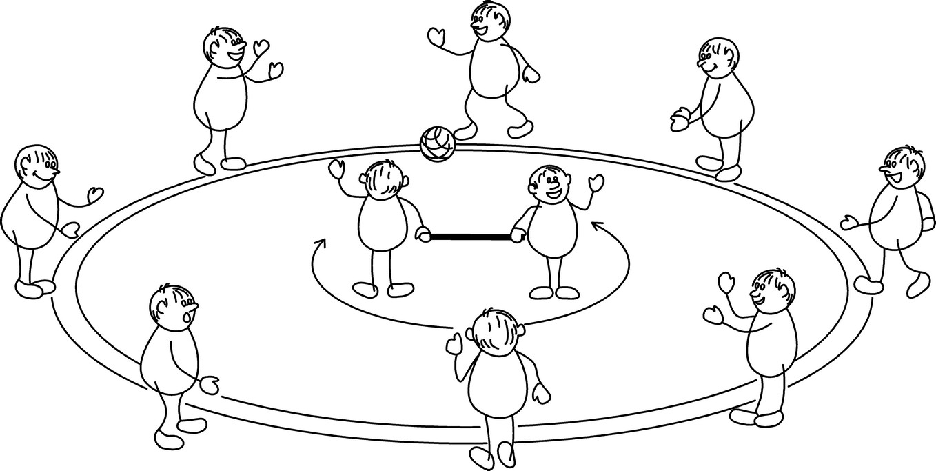 Игроки стоят в хороводе лицом к центру круга. В центре — двое водящих. Они стоят боком друг к другу, но смотрят в разные стороны (см. рис.). Водящие держат гимнастическую палку на уровне плеч и выполняют роль футбольных ворот. «Ворота» внутри хоровода могут кружиться с разной скоростью по часовой или против часовой стрелки. Игрокам, стоящим в хороводе, предлагается, не сходя с места, одним ударом закатить мяч в ворота. Промахнувшийся игрок меняет того водящего, который стоит к нему лицом. В игре можно использовать сразу два мяча.