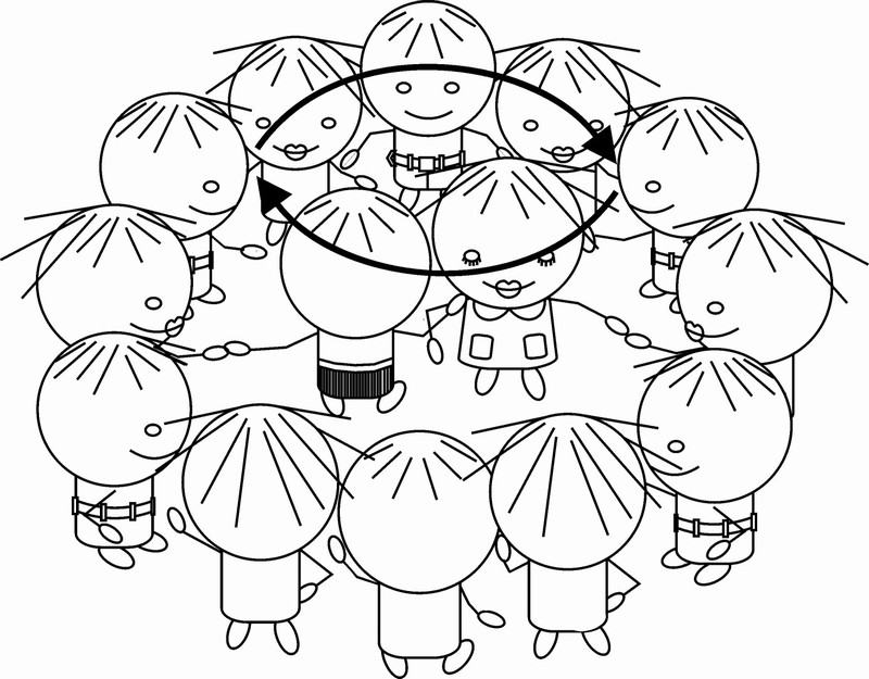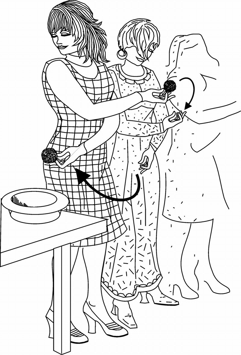Для игры можно использовать как маленькие предметы (бобы, скрепки), так и предметы побольше (мандарины, яблоки, спичечные коробки). Для каждой из команд, стоящих в шеренгу напротив друг друга, готовим по 10 предметов, помещаем их в корзинку или тарелку с одной стороны колонны. Здесь же ставим вторую емкость, но пустую. Первый игрок берет один предмет правой рукой и передает соседу, который, принимая его также правой рукой, передает дальше. Последний игрок в шеренге, взяв предмет правой рукой, перекладывает его в левую и начинает передачу назад, к началу шеренги, но все действия совершаются левой рукой (рис. 1). Поскольку первый игрок, не дожидаясь, когда первый предмет вернется, начинает передавать второй, третий и т. д. предметы, то играющим нужно быть очень внимательными, чтобы принимать и передавать их в «правильные» стороны. Предмет, который вернулся к первому игроку, кладут во вторую емкость. Побеждает команда, быстрее собравшая все предметы на старте.