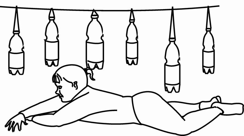 К горизонтальной палке на разной высоте привязывают веревками пластиковые бутылки, наполовину заполненные водой (см. рис.). Игроки должны проползти под "полосой препятствий" так, чтобы бутылки не были задеты и не стали раскачиваться. "Полоса препятствий" может быть одна, тогда учитывается время игроков, затраченное на прохождение полосы, и вычитаются штрафные очки. Расстояние от земли до самой низкой бутылки определяется опытным путем.