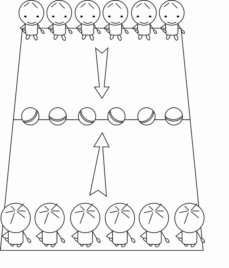 Для игры организуют две команды по шесть человек и готовят шесть мячей. Игровую площадку делят пополам, на границе через равные расстояния устанавливают шесть мячей. Игроки занимают места на своей половине поля (см. рис.). По сигналу они бегут к мячам, стараясь схватить их первыми и бросить в соперников. Те, кого задели мячом, покидают площадку. Если игрок смог поймать мяч, брошенный соперником и не отскочивший от земли, то один из выбитых ранее игроков его команды возвращается на площадку. Цель игры — выбить всех противников. Заступать на чужую половину поля запрещается.