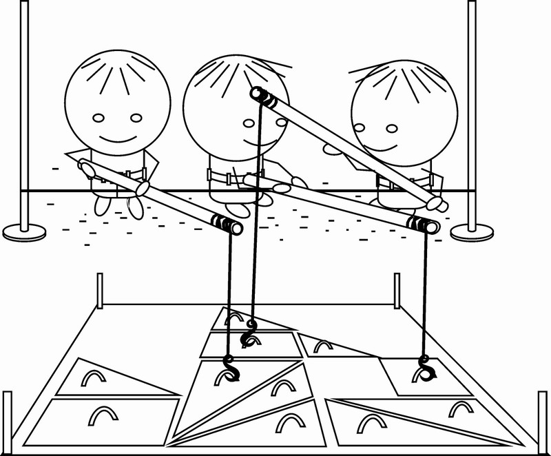 Соревнуются две команды. Удочками с крючками 2-3 игрока стараются подцепить геометрические фигуры с петлями, из которых составлен большой квадрат (см. рис.). Остальные участники команды переносят «пойманные» фигуры в определенное место и вновь складывают из них квадрат.