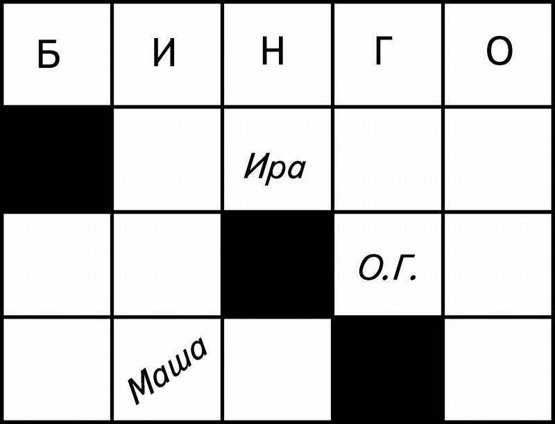 Заранее приготовьте для игры карточки размером 5 х 10 см. Это таблицы из пяти столбцов, в верхние клетки которых вписаны буквы из слова «бинго». Количество пустых клеток равно количеству девочек в классе (лишние клетки на всех карточках одинаково заштриховываются). Девочки пишут свои имена и фамилии на листках, которые затем опускают в мешочек. Каждому мальчику вручается карточка «Бинго». В течение 5-10 минут им необходимо подойти ко всем девочкам и попросить их расписаться или оставить инициалы в любой клеточке карточки (см. рис.). Чтобы девочки охотнее расписывались, можно делать им комплименты, спрашивать о любимых телепередачах, животных и т. д. Таким образом заполняется вся карточка. После этого проводится розыгрыш. Ведущий вытаскивает из мешочка листок и громко читает имя и фамилию девочки. Ребята в своих карточках отмечают соответствующую клетку. Тот игрок, у которого в столбце или строке отмечены все клетки, кричит «Бинго» и получает приз, например, шоколад, пряник и т. д. Итоговый приз — коробку конфет — получат те, у кого набрано больше малых призов.