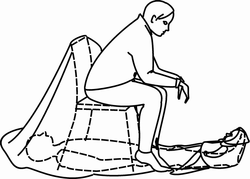 Розыгрыш готовят двое: ведущий и его помощник, который должен пройти в комнату незаметно, чтобы гости были уверены в том, что в игре принимает участие только один человек. На середину комнаты ставится стул, помощник ложится под него так, чтобы были видны ноги, которые ведущий обматывает тряпками, одевает детские вещи, имитируя куклу. На ступнях завязывается платок или надевается шапка, и прикрепляется нарисованное на бумаге лицо. Стул закрывают большим покрывалом, чтобы скрыть голову и туловище помощника (см. рис.). Комната должна быть затемнена, только горит свеча. Гости приглашаются в комнату по одному. Текст ведущего: "Посмотрите, посередине комнаты лежит девочка, перерезанная трамваем. Увы! Она мертва. Только вы можете вернуть ее к жизни. Вы хотите ей помочь? Если да, то садитесь на стул, но не задевайте бедную девочку ногами. (Чтобы игрок не думал о подвохе, ведущий может сам сесть на стул, чтобы продемонстрировать его безопасность.) Скажите три раза: "Девочка, воскресни". Смотрите ей прямо в глаза". Игрок выполняет требование, помощник резко поднимает ноги вверх, стараясь, конечно, не набить шишку на лбу игрока. При выходе ведущий напоминает о необходимости держать увиденное в тайне.