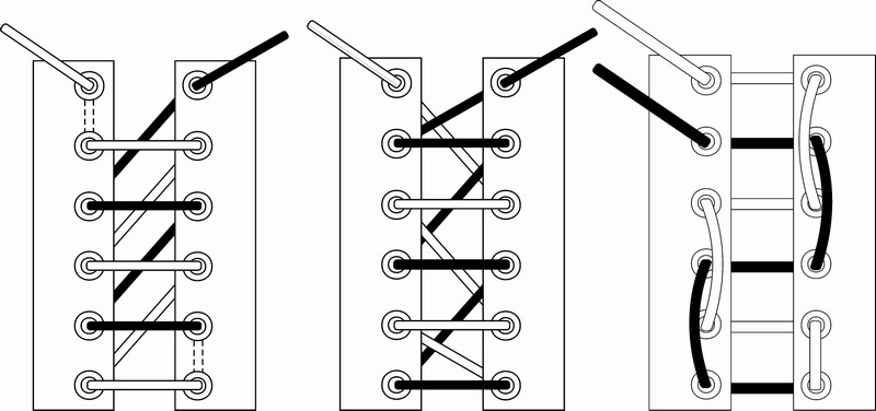 Для шнуровки необходимо приготовить веревки одинаковой длины и вырезать из толстого картона макет ботинка с отверстиями в два ряда. Для зрелищности можно вырезать не макет, а прямоугольники с рядами отверстий, которые будут держать ассистенты. Соревнования по шнуровке могут проходить в несколько этапов: экономная шнуровка (у кого длиннее оставшиеся концы веревки), стильная шнуровка (самый интересный рисунок, см. рис.), шнуровка по расчету (самые короткие концы веревки), шнуровка грамотеев («написать» веревкой слова «хит», «гипс», «посох» и т. д.).
