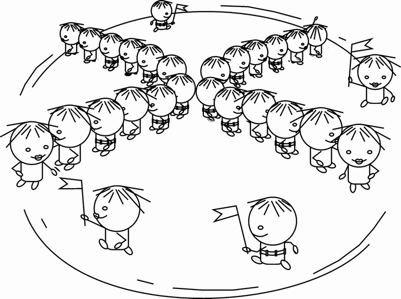 Эстафета для нескольких команд. Команды выстраиваются в колонны, которые располагаются лучами от центра, как спицы колеса (см. рис.). Все игроки, стоящие с внешнего края, получают по флажку. По сигналу они бегут по кругу в заданном направлении и, обогнув его, передают флажки вторым участникам своих команд. Затем первые игроки занимают места в конце колонн. Побеждает команда, последний участник которой раньше всех передаст флажок первому игроку.