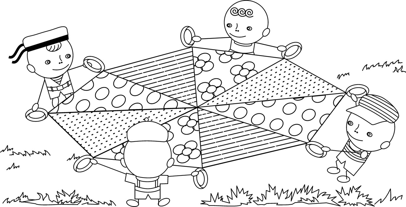 Парашюты — круги разных размеров (от 4 до 7 метров), которые сшиты из цветных тканевых секторов (см. рис.). На месте соединения секторов с краю пришивается петля, в которую свободно входит рука взрослого человека.