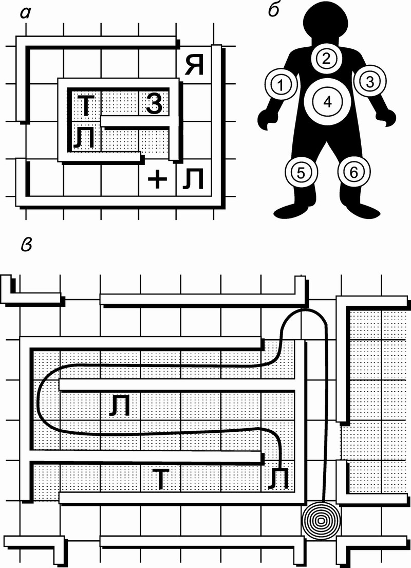 На одну клетку можно помещать несколько объектов. Свою карту игроки никому не показывают. Двигаться можно только по вертикали или по горизонтали, отмечая на карте свои ходы. Движение описывается или словами («двигаюсь на одну клетку вверх, пово-рачиваю направо и иду по коридору»), или координатами («иду до Б6, потом до К6»). Во время хода соперник отслеживает траекторию движения по своей карте помех и сообщает о том, какие объекты встречаются: «Вы завернули за угол и увидели террориста». Ход продолжается до тех пор, пока не произойдет столкновение с каким-либо объектом на карте противника (рис. в), после этого начинается этап взаимодействия с объектом. Затем право хода передается сопернику, т. е. теперь он будет описывать свои перемещения. Если вы попали на клетку с ямой, то «проваливаетесь» и пропускаете ход. Ямы действуют постоянно на протяжении всей игры, т. е. можно потерять ход еще раз, проходя через эту клетку. Попадая в ловушку, вы получаете ранение. Ловушки тоже действуют постоянно. Артефакты — объекты, которые не влияют на здоровье. Их поиск является целью игры (это могут быть сокровища, заложники и т. д.). Чтобы получить артефакт, достаточно встать на клетку, в которой проставлен соответствующий символ. Аптечки позволяют «вылечить» все ранения, полученные до этого момента. Ранения помечаются проставлением любых знаков в ряд, а после получения аптечки перечеркиваются. Можно не использовать аптечку и вернуться к ней позже, передав ход сопернику. Аптечка используется только один раз. Если получено 15 ранений до нахождения аптечки, то игра заканчивается победой соперника. Артефакты и аптечки могут располагаться на тех же клетках, что и препятствия. Когда вы попадаете на клетку с террористом, то должны вступить с ним в бой и уничтожить его. Соперник отмечает «слабое место» у террориста, обводя одну из пронумерованных областей на специальной игровой диаграмме на бланке сценария (рис. б). Вы «стреляете» по террористу, пытаясь угадать номер «слабого места». Если вы угадали, то террорист погибает и ваш ход заканчивается, если нет, то получаете одно ранение, которое отмечается на индикаторе имеющихся ранений. Продолжайте «стрелять» по террористу, получая ранения за каждый промах, до тех пор, пока вы его не убьете. Во время следующего хода можно двигаться дальше. Если террорист был убит, клетка, на которой он находился, становится безопасной для перемещения. Взаимодействия с объектами, расположенными на одной клетке, происходят в следующем порядке: артефакты, террористы, другие препятствия (ямы, ловушки).
